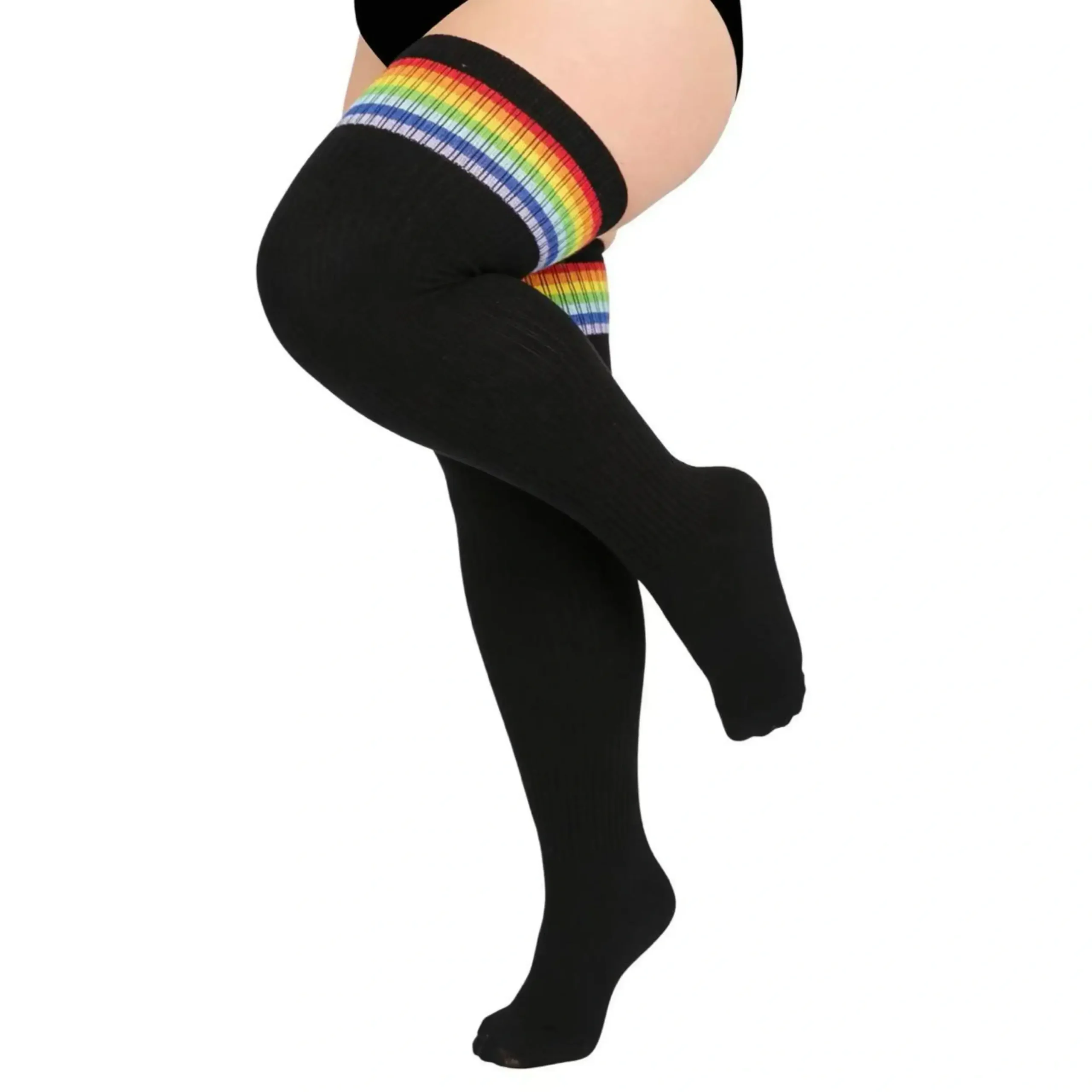 These socks are absolutely amazing! The black ribbed material is flattering, the rainbow stripe is vibrant, and they fit my curvy thighs perfectly. They’re soft, durable, and stay up all day without any discomfort.