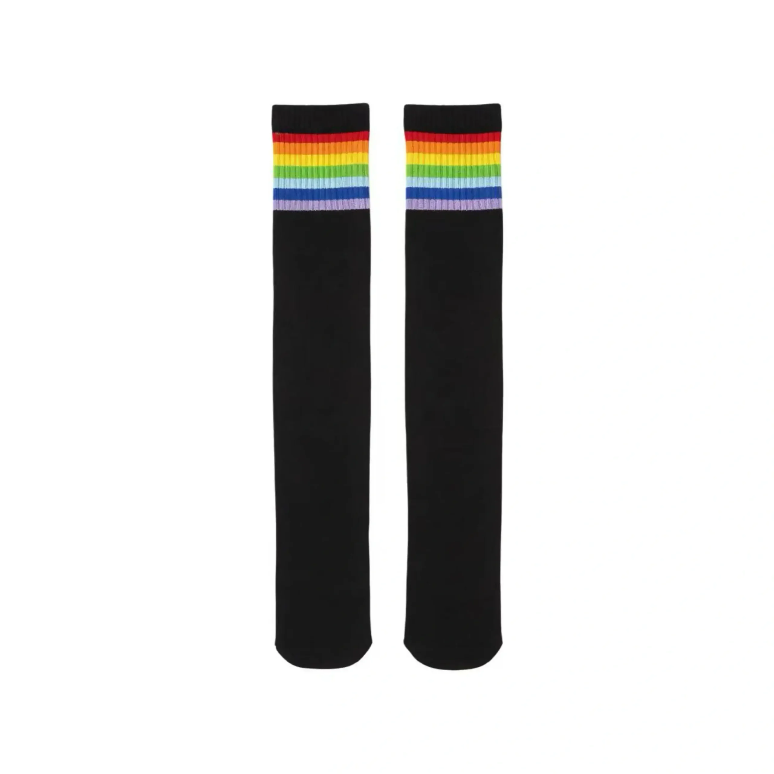 These socks are absolutely stunning! The black ribbed material is super flattering, the rainbow stripe is vibrant, and the wide band keeps them up all day. I’ve worn them to pride events and casual outings—they’re so versatile!
