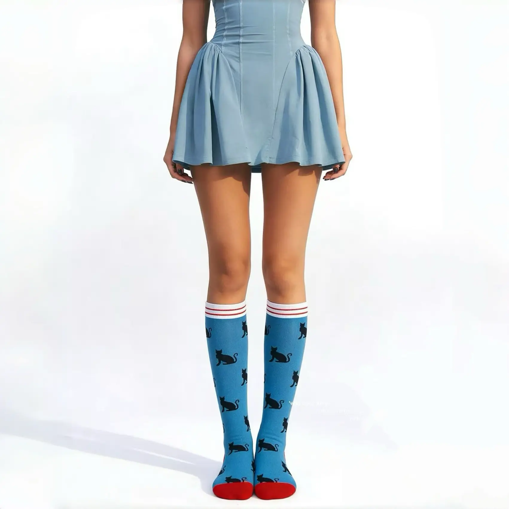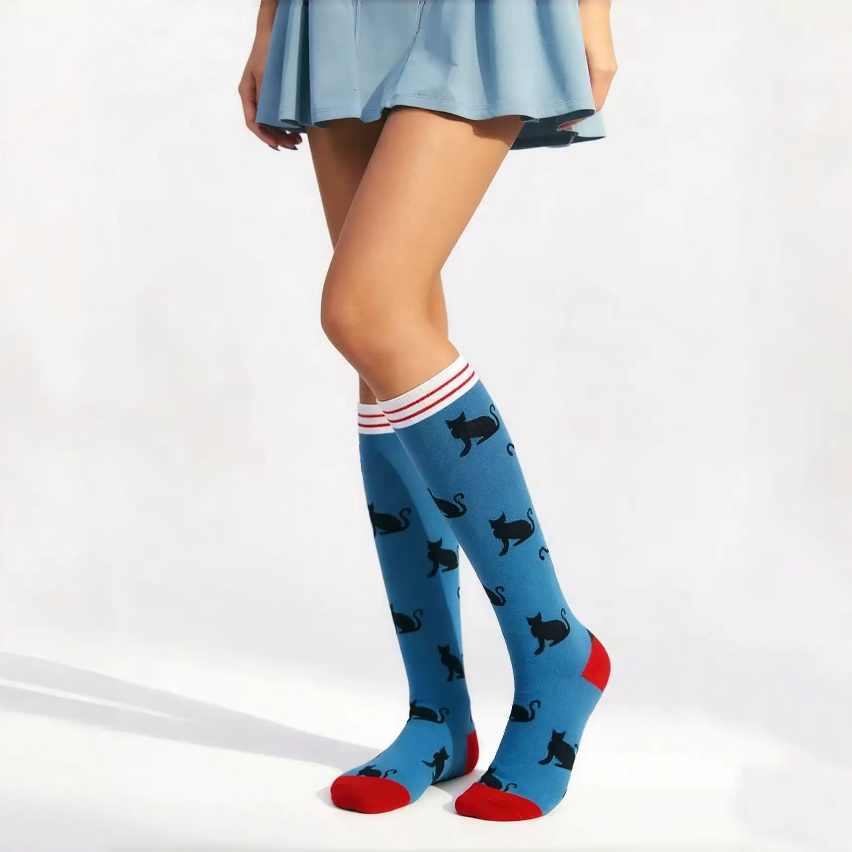 I absolutely love these blue socks! The black cat design is so whimsical, and the red toes are such a cool touch. I have thick calves, and these fit me like a dream—no bunching, no rolling down. The material is soft and smooth, and the compression is perfect for my post-work leg fatigue.