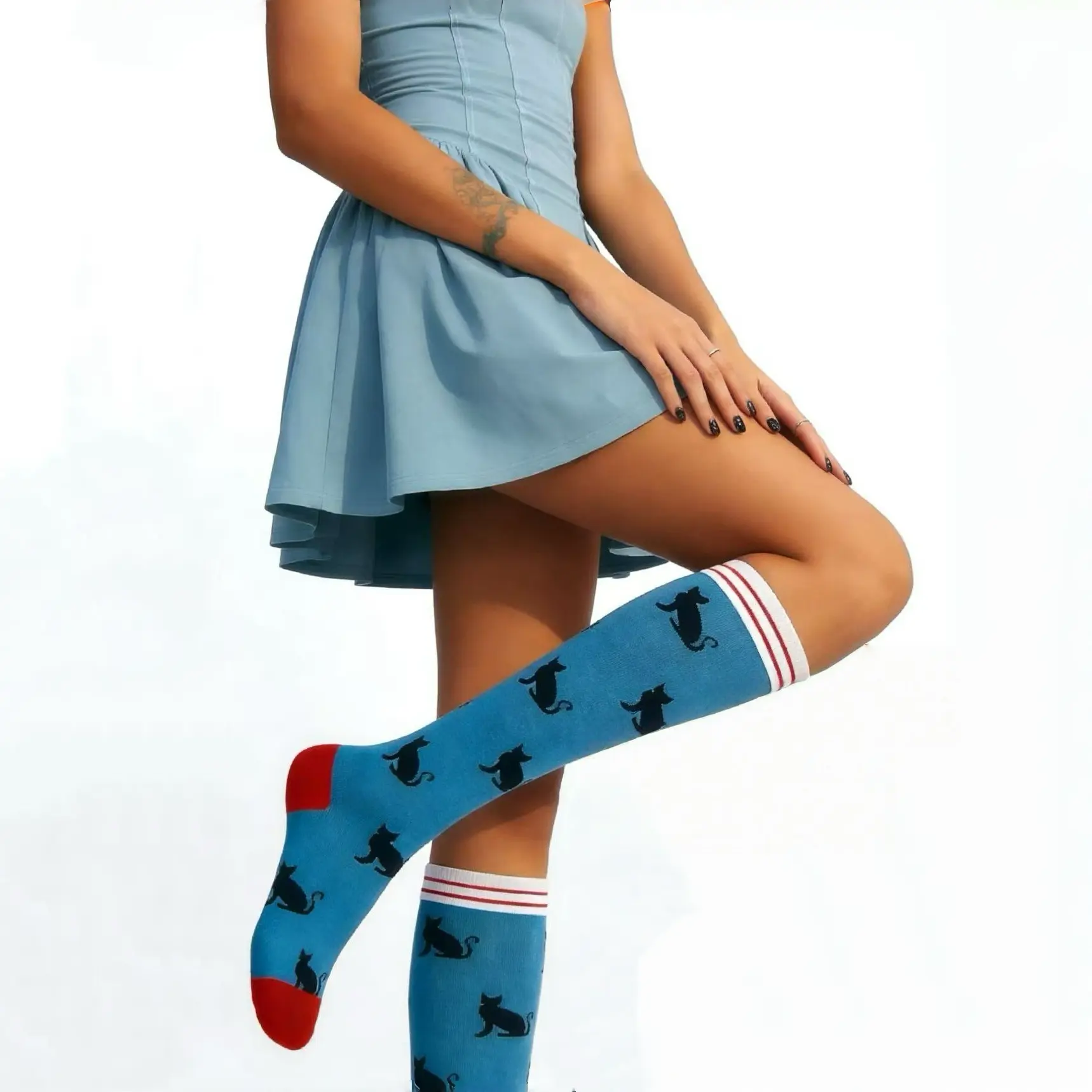 I’m absolutely obsessed with these blue knee-highs! The black cat print is so cute and whimsical, and the red toes add such a fun contrast. I was worried they’d be too tight around my thighs, but the stretch is amazing—they’re super comfy and don’t roll down. They pair perfectly with my mini skirts and dresses, making any outfit feel playful.