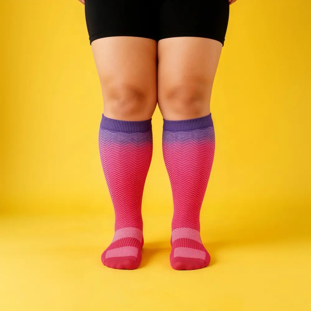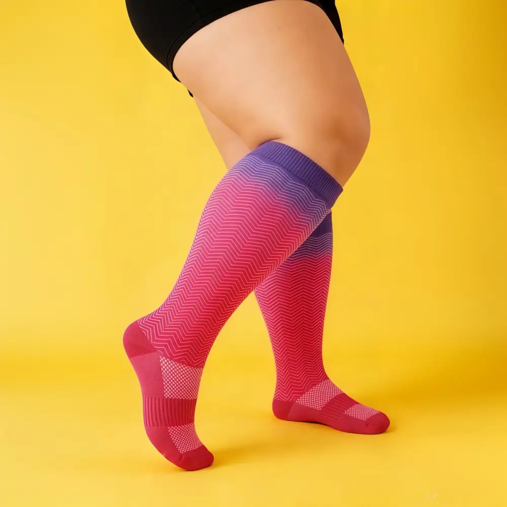 These pink-purple gradient compression socks fit my plus-size calves so well, no tightness or rolling down. The gentle compression eases my tired legs after long workdays, and the stylish chevron pattern makes me feel cute and confident all day long.
