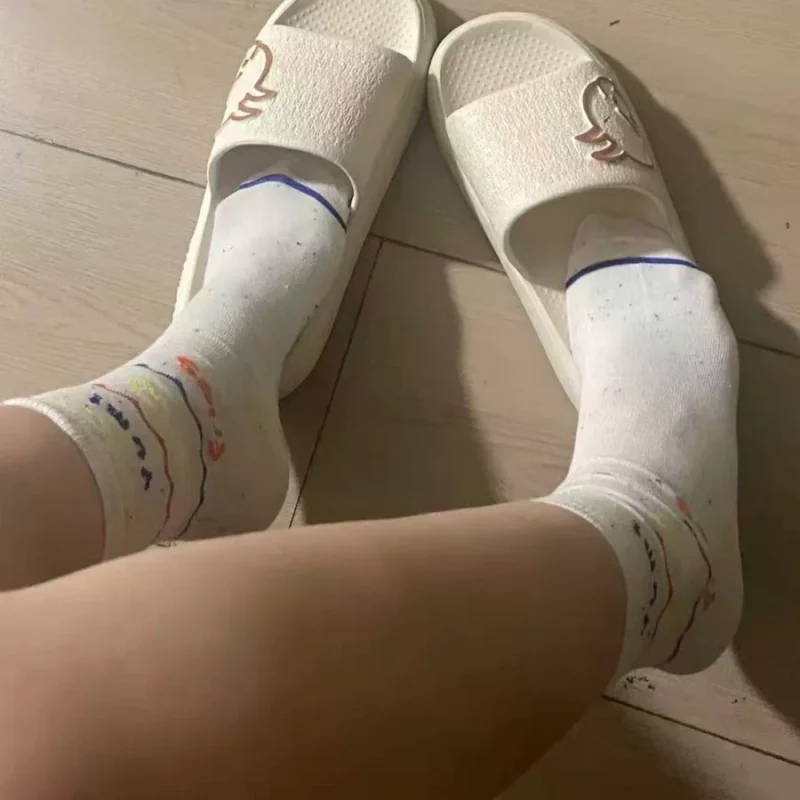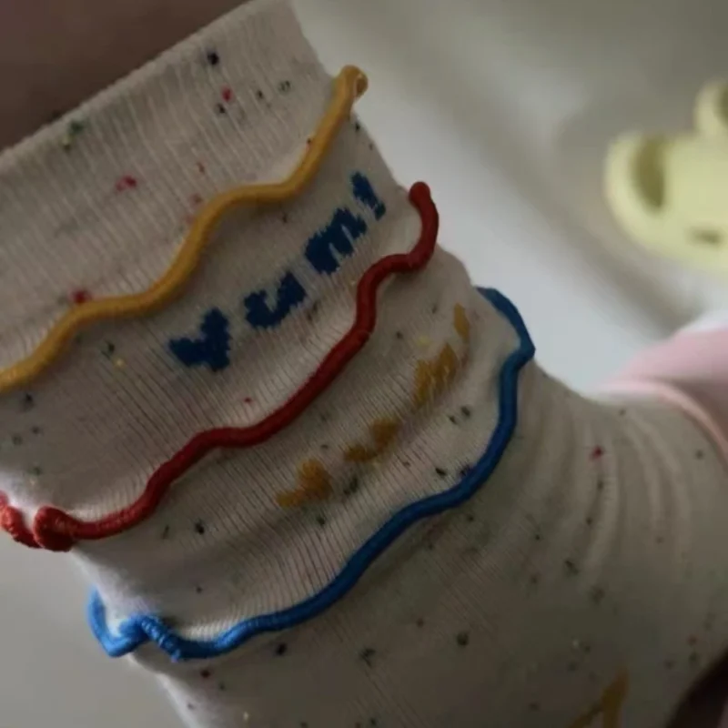 The toe area features a machine-stitched construction (non-seamless design) that fits naturally to the foot, minimizing rubbing and irritation. The sock body incorporates a mix of abstract graphics, color-blocking, gradients, stripes/plaid patterns, and letter/number typography, creating a playful yet versatile look that pairs easily with a wide range of outfits.