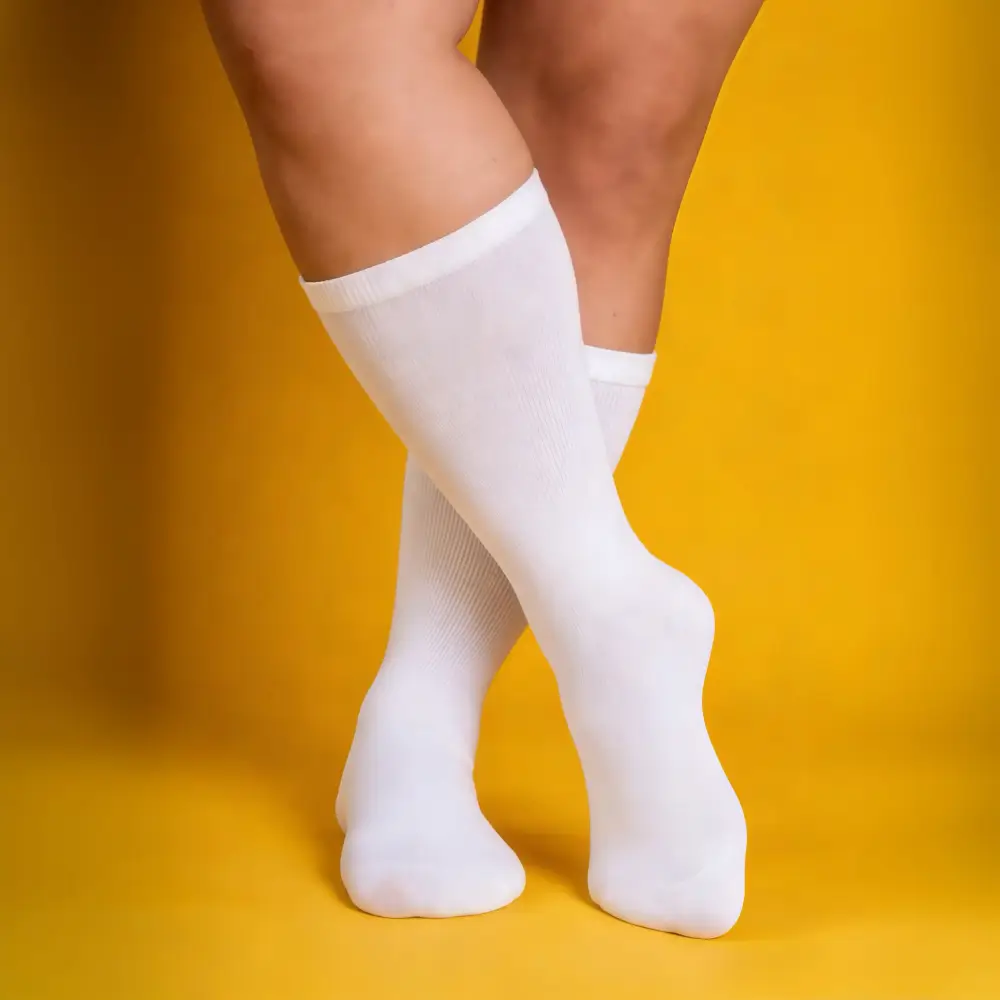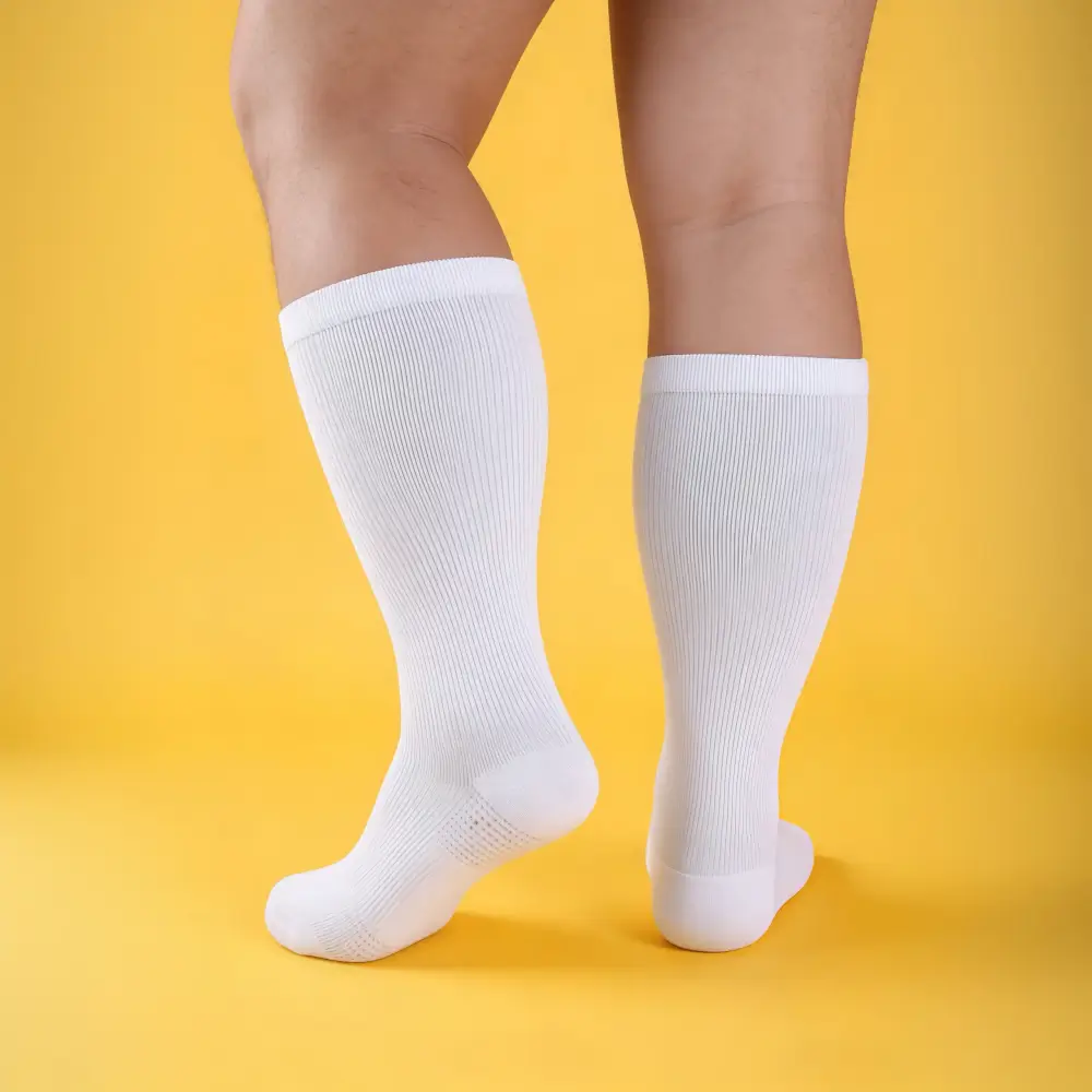 These high-top compression socks are engineered for superior comfort and functionality. Made from a premium blend of 80% Nylon and 20% Spandex, they offer excellent moisture-wicking, high elasticity, and durable support. Featuring a hand-linked seamless toe for chafe-free comfort, this series is specifically designed to accommodate larger foot and calf dimensions, making them ideal for all-day wear in both casual and athletic settings.