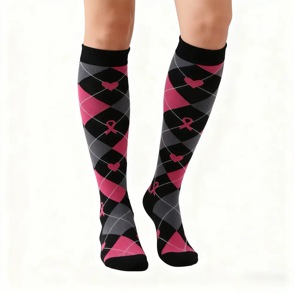 I’m a runner training for a half-marathon, and these socks are great for post-run recovery! The mild compression reduces soreness in my calves, and the cute argyle pattern makes me feel happy even after a tough workout. I’ve recommended them to all my running friends who support breast cancer awareness.