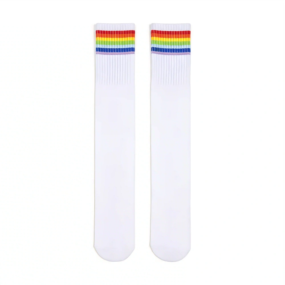I’ll be honest—I was a little worried these would be too bright or tacky, but they’re actually really cute and subtle in person. The rainbow stripe is vibrant but not overwhelming, and the rest of the sock is a nice neutral cream color that goes with everything. They fit my thick thighs really well, though I did have to adjust them a couple times during the day. Not perfect, but pretty good for the price.
