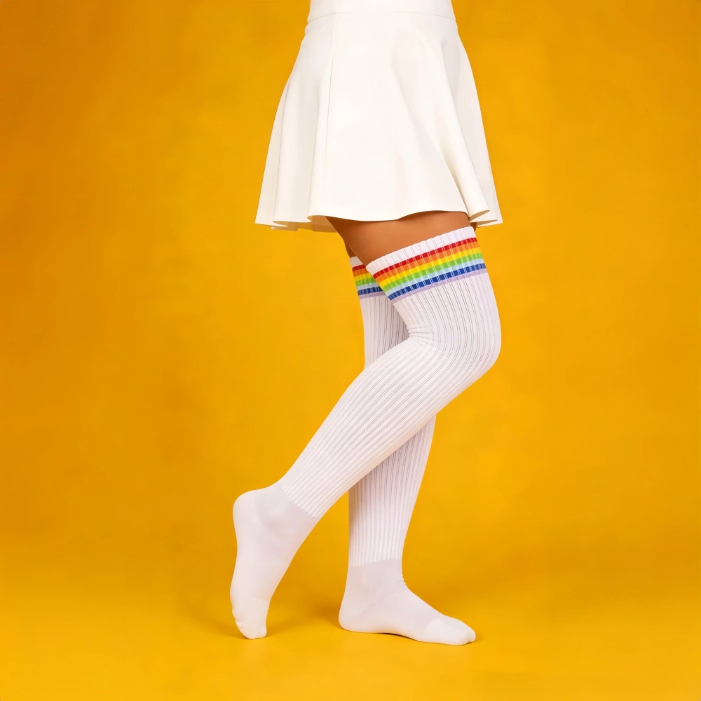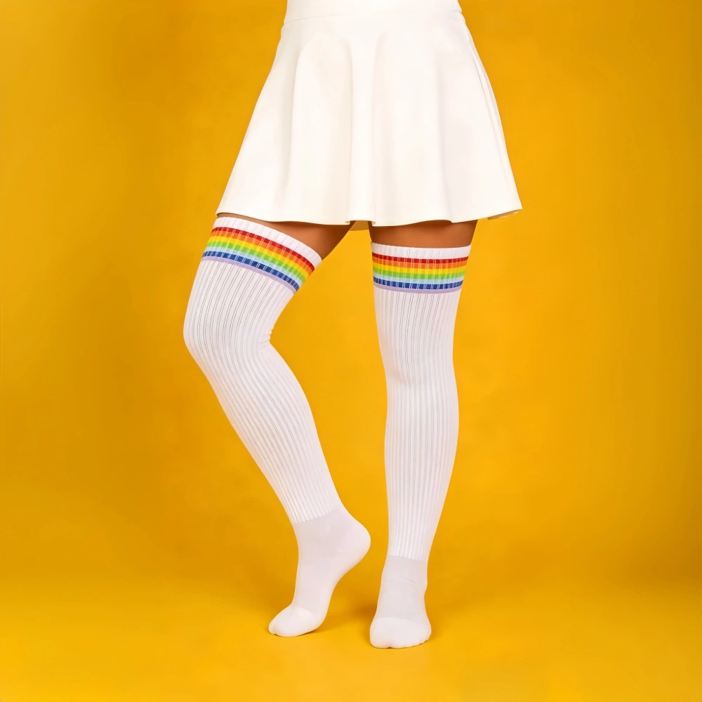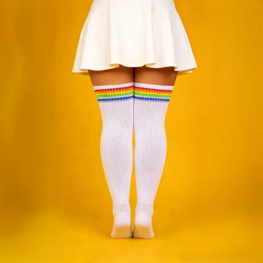 I fell in love with these rainbow-striped thigh-highs the second I saw them! As a curvy woman who’s passionate about LGBTQ+ pride, I’ve been searching for a pair that’s both inclusive and comfortable—and these deliver on every front. The stretchy ribbed knit hugs my thighs so gently, no pinching or rolling down, even after a full day of walking around pride parades. The vibrant rainbow stripe at the top is bold and beautiful, a perfect way to show my pride without being over-the-top. I paired them with my white tennis skirt and platform sneakers for the parade, and I got so many compliments on how bright and joyful I looked. They’re more than just socks—they’re a celebration of who I am!