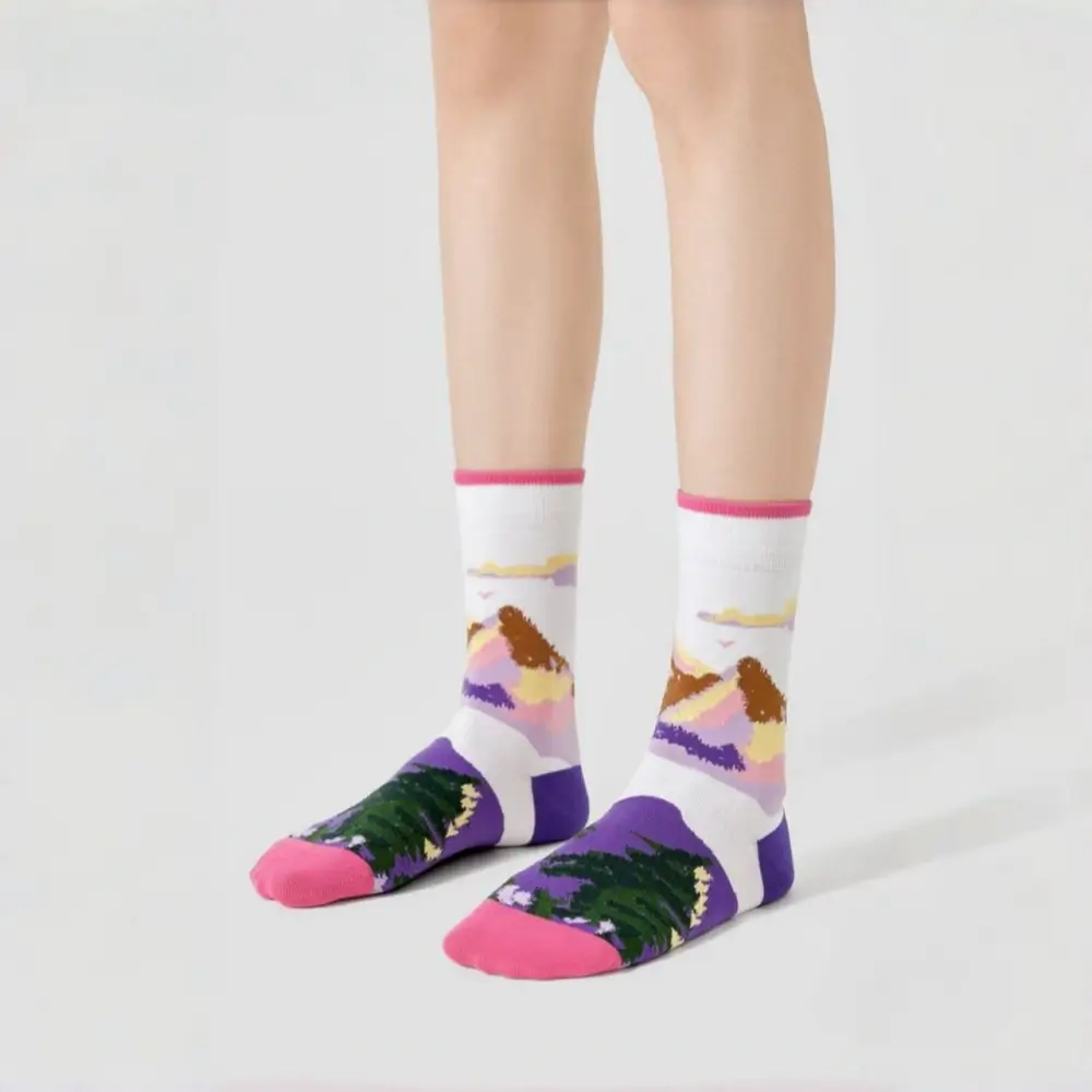 These socks are the perfect blend of comfort and whimsy! I love the purple mountain scene with pink accents, and the soft cotton feels amazing on my feet. I wear them with my favorite sneakers and cropped jeans, and they always get compliments. The seamless toe means no blisters, and they wash well without fading. I can’t imagine my sock drawer without them now!