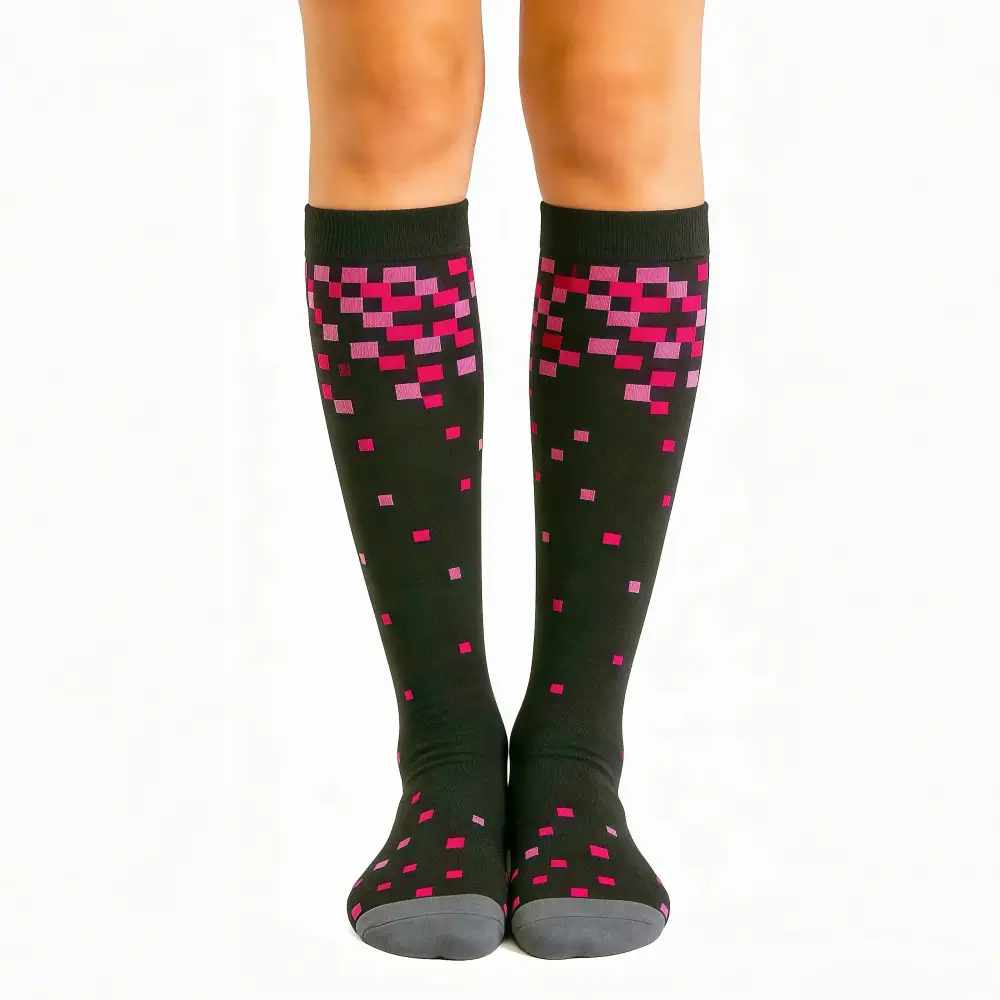 I bought these black with pink pixel hearts socks for long days on my feet, and they’ve transformed my routine. The compression supports my calves during long walks, keeps my feet dry, and prevents blisters. I can go all day without leg pain, and the pixel heart pattern gets so many compliments!