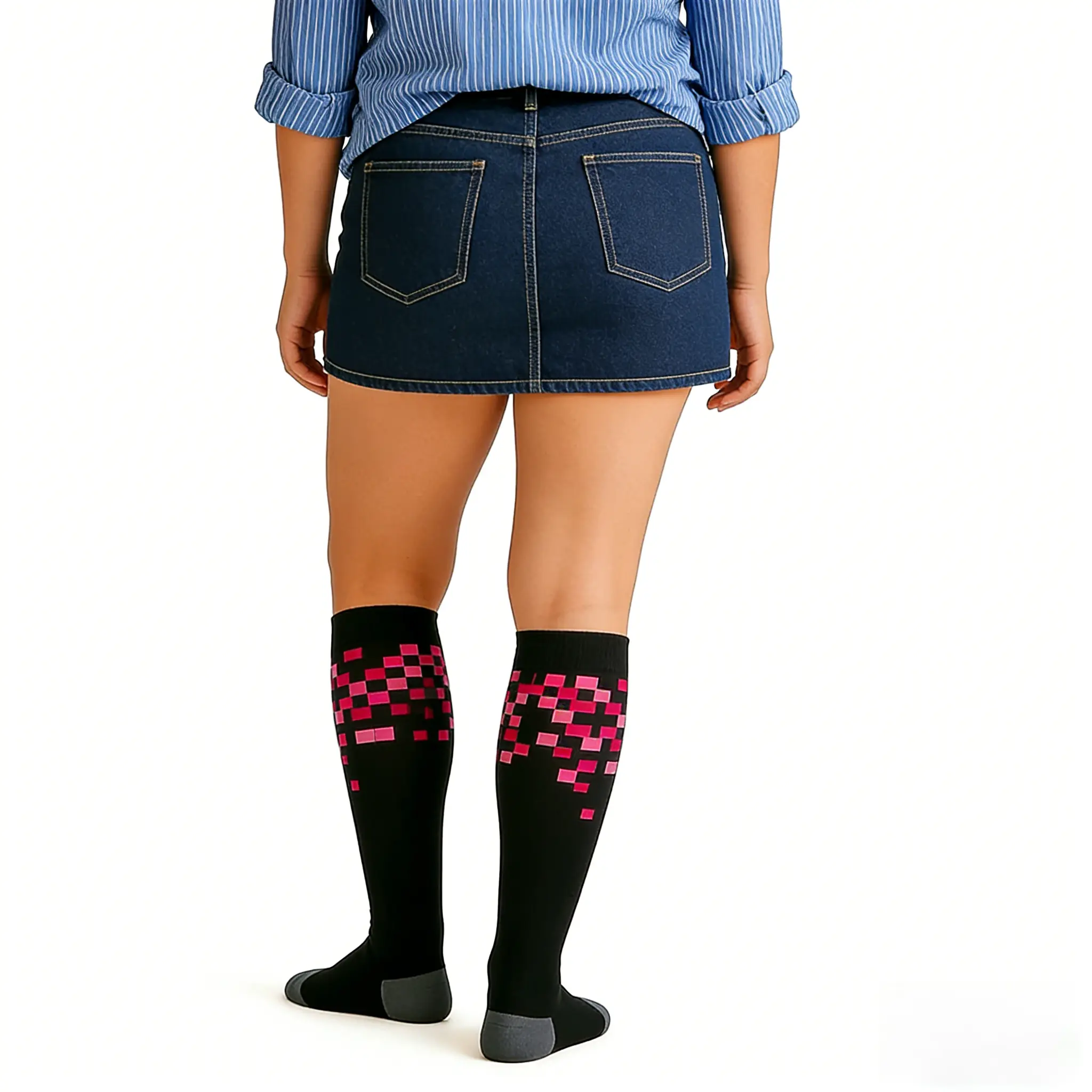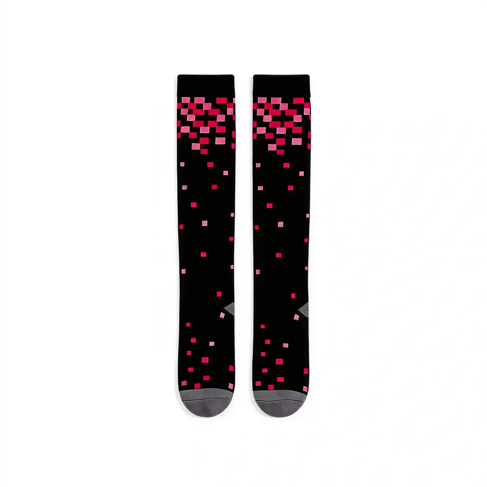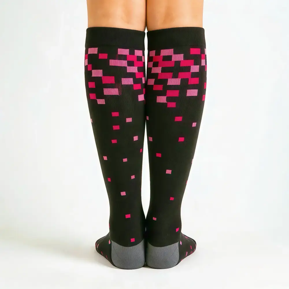 These black pixel socks are sturdy and comfy, holding up to all my daily bending and lifting. No more sore legs by the end of my day, and the pink pixel pattern is so fun and cheerful.
