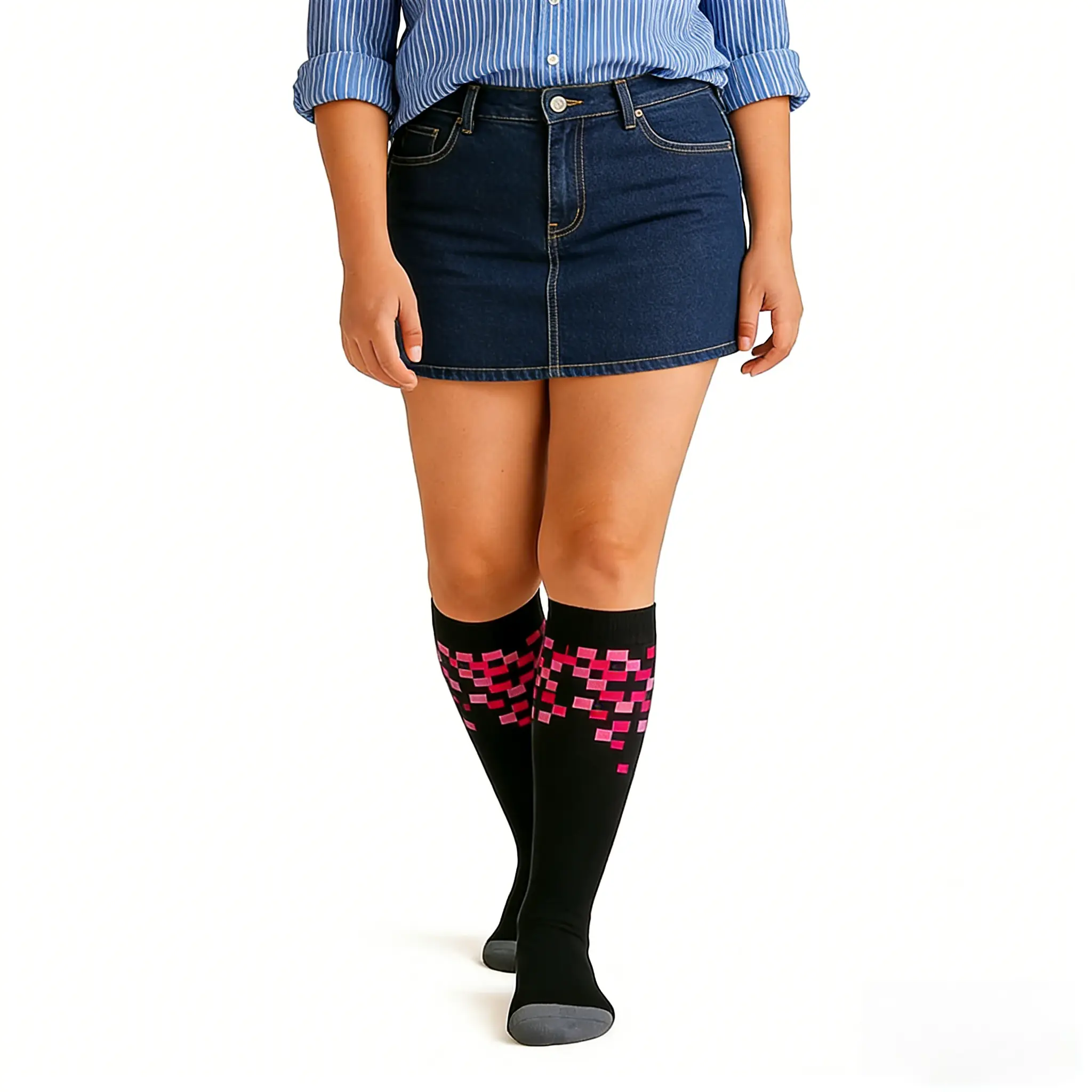 I bought these black striped pixel heart socks—stylish for any event, supportive, and comfy all day long. The pink pixel design adds a romantic touch to my outfits.