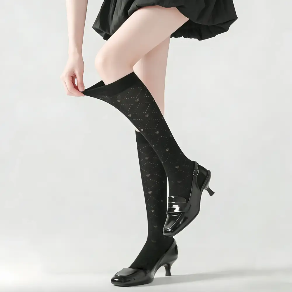 I was hesitant to try sheer knee-highs, but these black heart ones changed my mind! The lightweight, breathable knit is perfect for mild fall days, and the subtle heart pattern adds just enough detail without being too loud. I wore them to a coffee shop meeting with my boss, pairing them with a black blazer and high-waisted trousers. The sheer fabric peeked out just enough to add a feminine touch to my professional look, and my boss even commented on how “polished and put-together” I looked. The stretchy fit accommodates my muscular calves perfectly, and they didn’t bunch or slide down during the long meeting. I’m now a total convert to sheer knee-highs!